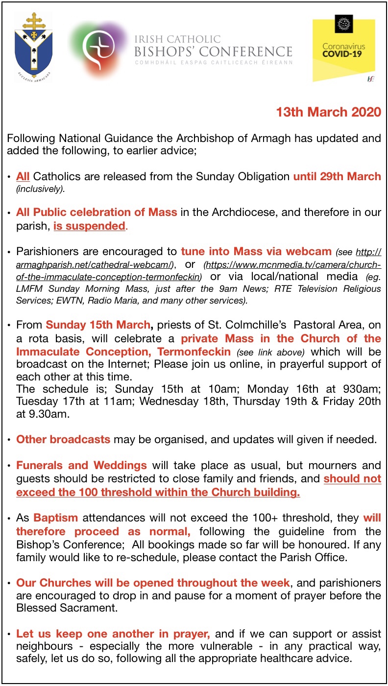 Unfortunately, we begin at a difficult time for our country and the wider world. As from 13th March, 2020, all public celebrations of Mass, and any non-essential parish gathering or function is suspended.