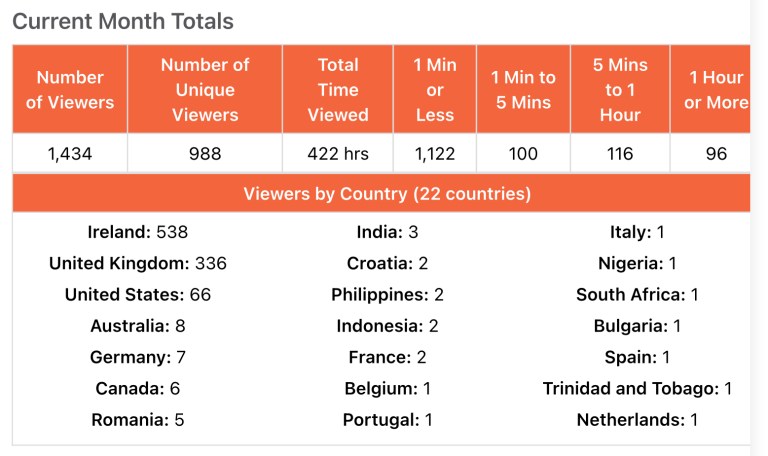 These are our stats for the month of August. The important number is the ‘5mins to 1 Hour’ number & the 1 hour + which shows the number of people who typically stay for the length of a Mass.