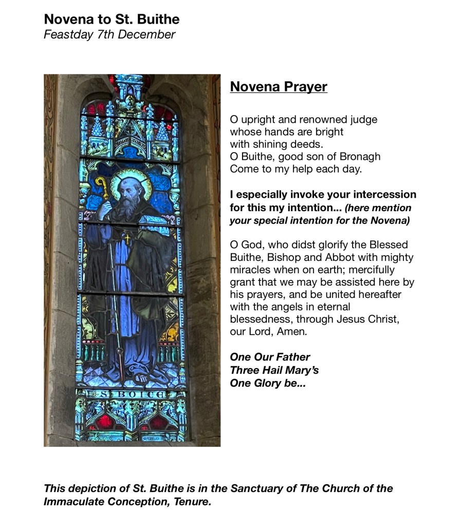 1. Sunday 5th December – Adoration of the Blessed Sacrament at 7pm, from the Church of The Nativity of Our Lady, Fieldstown – commemorating the life of St. Buithe. Available on the ‘Fieldstown’ tab of this website https://www.churchservices.tv/monasterboice