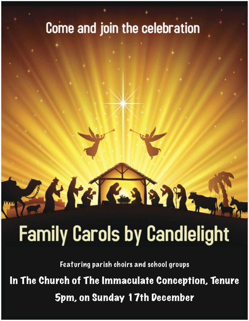 The Parish Carol Service will take place on Sunday 17th December 2023 at 5pm in The Church of The Immaculate Conception, Tenure. The service lasts about 45 minutes, and all are welcome.