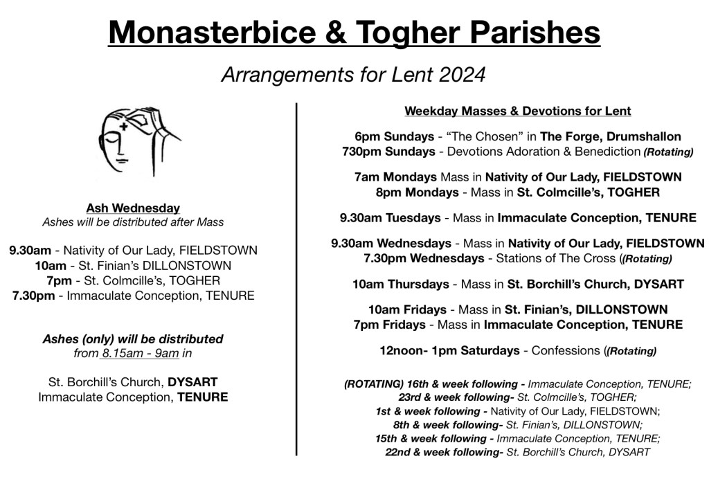 - Mondays 7am in The Nativity of Our Lady, Fieldstown and 8pm in St. Colmcille’s Togher