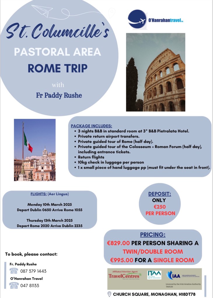 Space is limited, and this unique opportunity is sure to fill up quickly. Don’t miss out on the chance to deepen your faith and immerse yourself in the rich history and culture of Rome. Contact our travel agent today to book your place and start counting down to a journey that promises inspiration, reflection, and unforgettable memories.