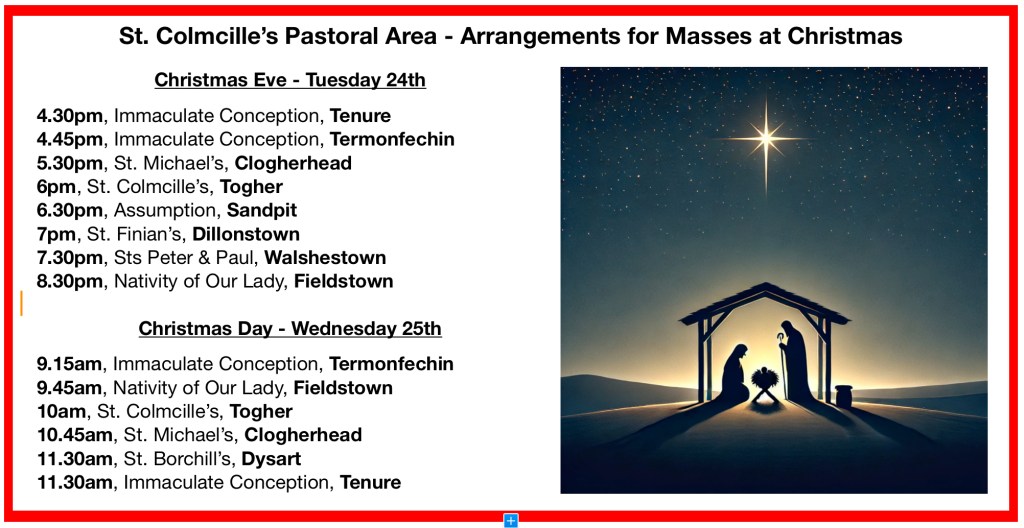 Whether you are a regular parishioner or someone who may have drifted away, we warmly encourage you to make a special effort to attend Mass this Christmas. The doors of our churches are open wide, offering you a place of peace, comfort, and belonging. The beautiful liturgies of Christmas remind us of the light that entered the world through the birth of Jesus and the promise of peace He brought for all.