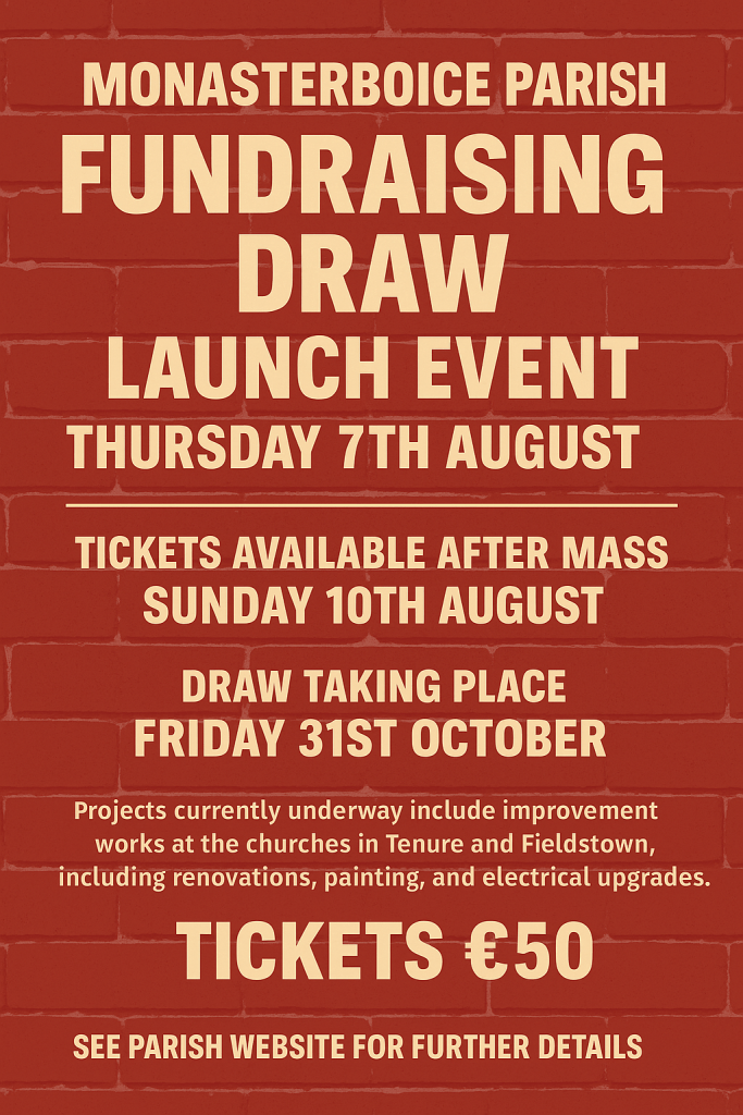 This an ideal moment to invite support from all – whether you attend regularly, only occasionally, or now live further afield but still hold Monasterboice close to your heart. The return of the Parochial House to Tenure is a milestone, and these improvements are an investment in the future of our parish and the wider community. We are grateful to the members of the Parish Finance Committee and the Fundraising Committee who have worked hard to bring this about, and who will be volunteering to sell tickets.